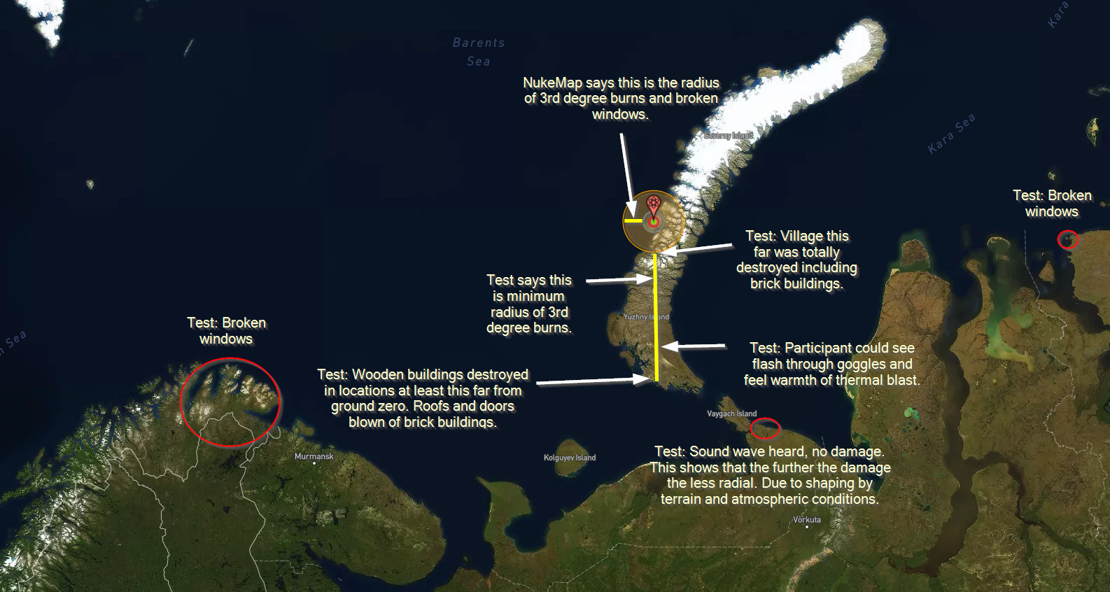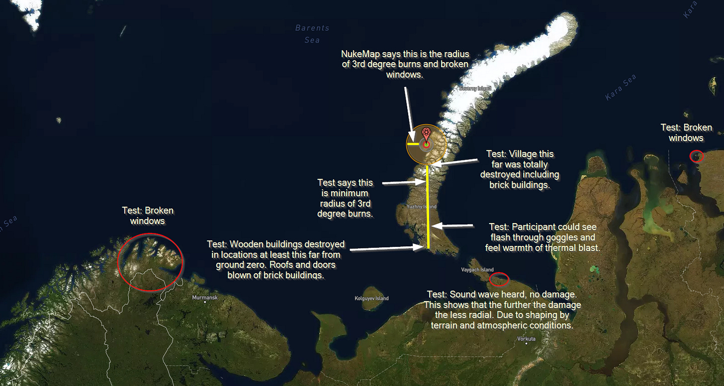 I have illustrated this by running nuke map’s simulation of the Tsar bomb where it was actually tested and then added the test results of the Tsar bomb to the map.
