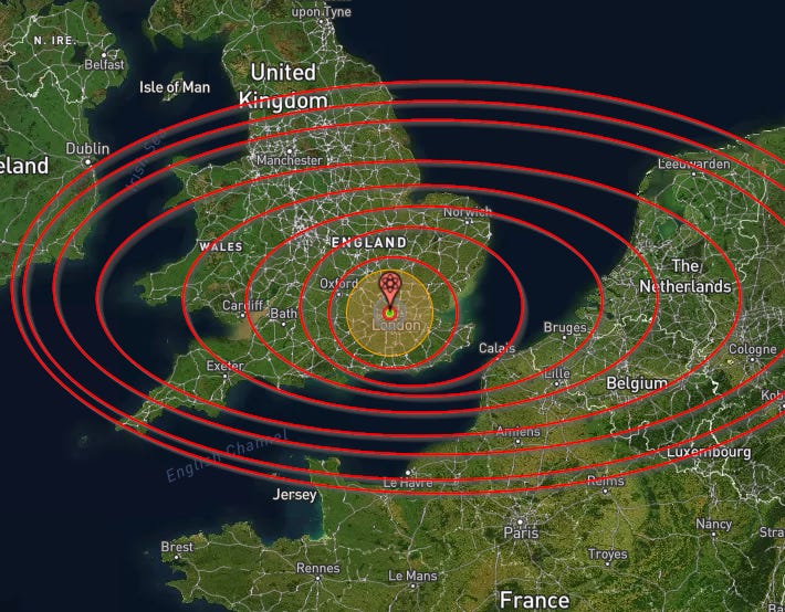 Despite being aware of NukeMap’s limitations I never really expected it to be so far off. I’ve always felt a sense of there being a mismatch with it because before NukeMap I’d studied things like the Tsar bomb test and remember coming to the conclusion that it could potentially ravage much of Britain. In a certain sense a single bomb that could destroy the entire country.